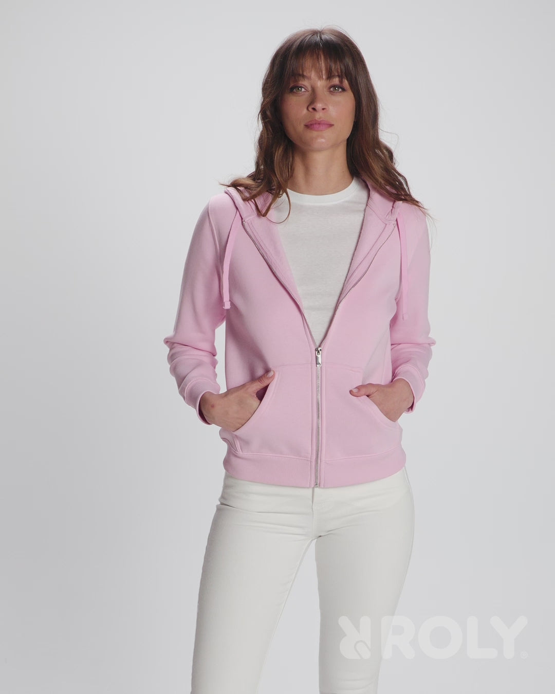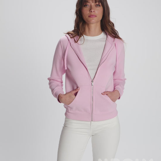 Fitted sweatshirt with front zip and hood. Metal zip. Kangaroo pockets, 2x1 ribbed cuffs and waistband with elastane. Matching flat drawstring in hood. Taped seams in matching fabric.